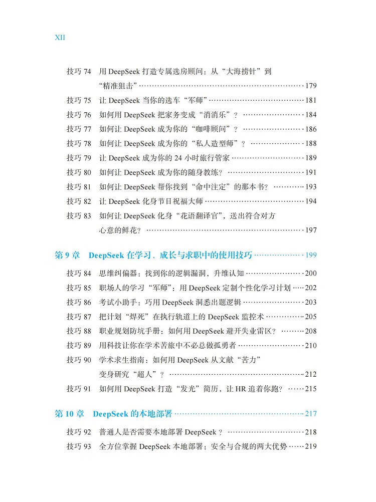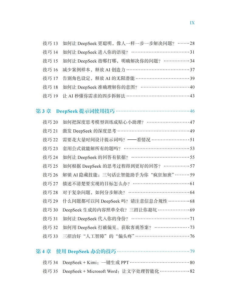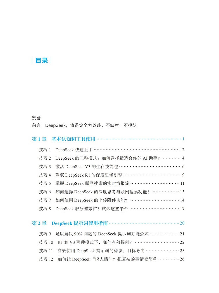 如果你不想缺席这一次人工智能浪潮,不想落后于你的同事、朋友,不想掉队,那么本书正是为你准备的。本书系统地提供了快速掌握DeepSeek的100个技巧。这100个技巧涵盖了以下方面: