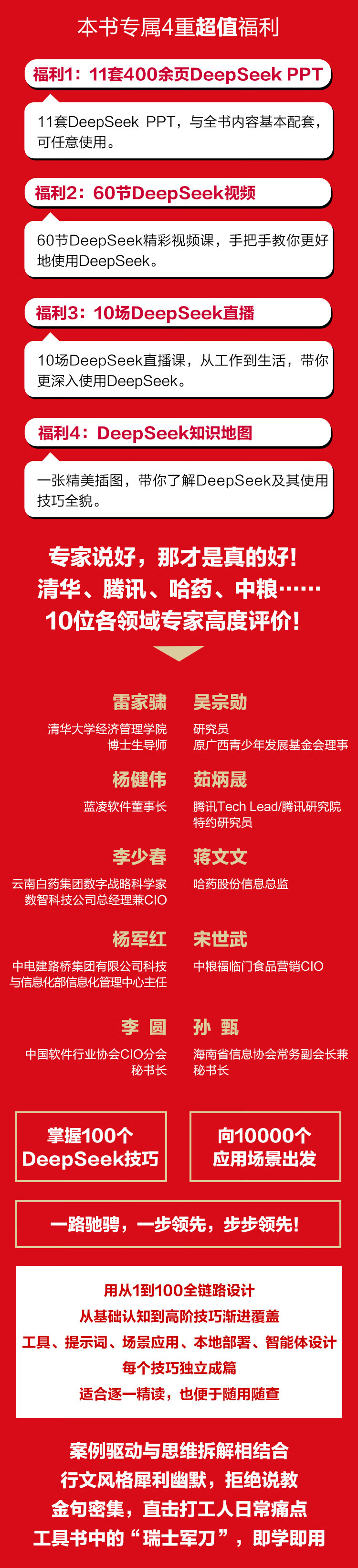科技发展的步伐,不会因为你我的等待观望而停滞,DeepSeek未来一定会有更为广泛的应用。拥有这“100”个技巧,是为了向“10000”个应用场景出发,更是为DeepSeek赋能千行百业打下基础。