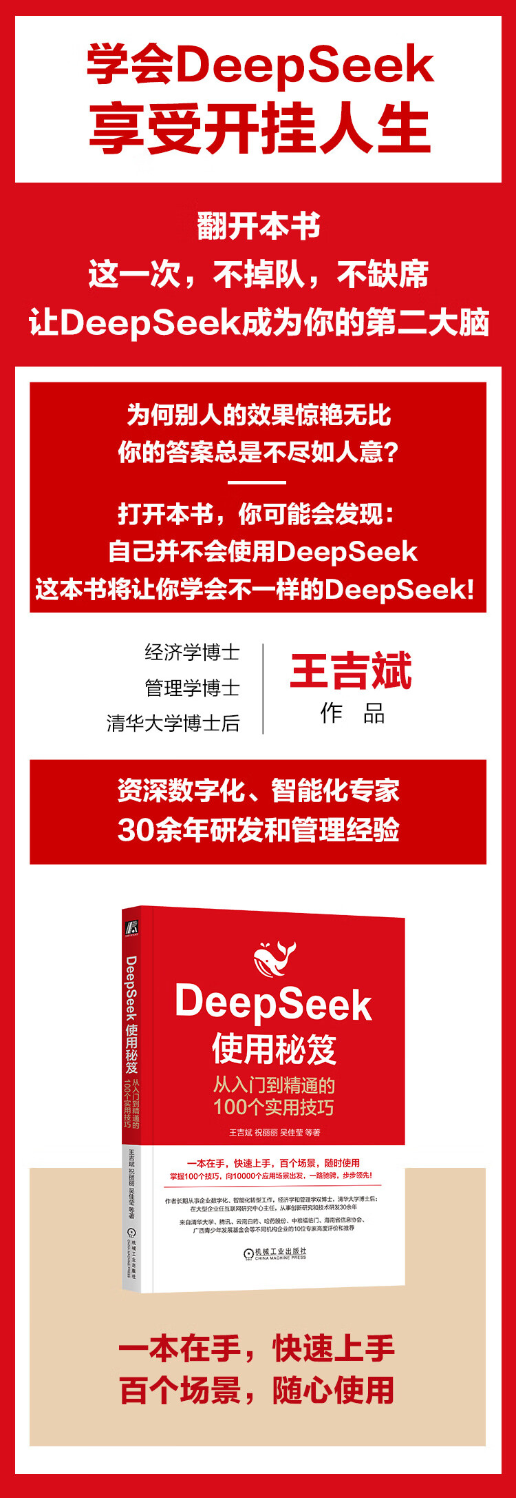 快速行动比完美计划更重要,这本书中给出的100个DeepSeek使用技巧不仅选取了大家急需、刚需的高频应用场景,而且每一个技巧都是你熟悉的场景、遇到的痛点,从0到1教你如何让DeepSeek帮你提高效率。