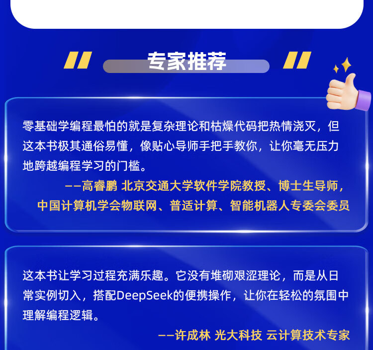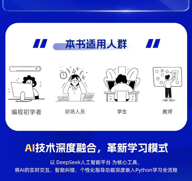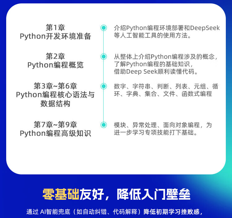 独特亮点:以DeepSeek大语言模型为教学伙伴,展示AI如何辅助编程学习;内容设计完全零基础友好,降低学习门槛